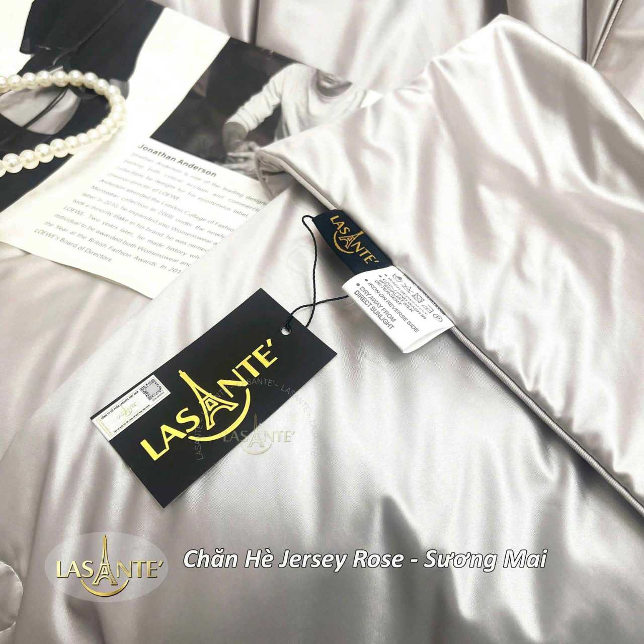 | Chất liệu Jersey | Lụa jersey - dòng chất liệu mới trong các sản phẩm lụa jersey của Lasante (set ga gối, chăn hè thu, khăn lụa). Là sự kết hợp của chất liệu lụa cao cấp mềm mịn kết hợp với sợi jersey - một loại vải dệt kim được cải tiến và sản xuất từ cotton kết hợp với PE và spandex, sử dụng kỹ thuật dệt kim đặc biệt giúp vải có sự óng ả, co giãn tối ưu và không bị cuộn mép. |
