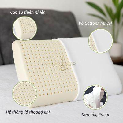 Gối cao su Lasante với thành phần cao su thiên nhiên đàn hồi, hệ thống lỗ thoáng khí giúp thông thoáng, tránh hầm bí, hạn chế tích tụ mồ hôi và vi khuẩn