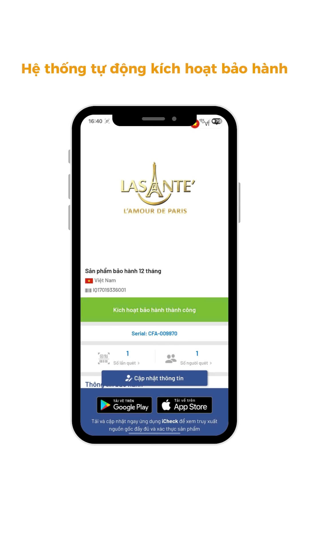 Sự kết hợp giữa Lasante và iCheck đánh dấu bước tiến quan trọng trong việc ứng dụng công nghệ vào quản lý sản phẩm. Từ nay, toàn bộ sản phẩm Lasante đều được gắn tem QR code iCheck, cho phép khách hàng kiểm tra nguồn gốc, xác thực chính hãng và đăng ký bảo hành điện tử chỉ với vài thao tác quét mã bằng điện thoại.