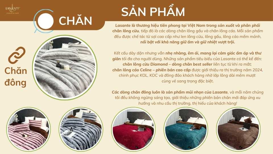 Lasante tự tin là thương hiệu tiên phong tại Việt Nam trong sản xuất và phân phối chăn lông, đặc biệt là chăn lông cừu. Các dòng chăn đông là sản phẩm mũi nhọn và mỗi năm Lasante đều không ngừng sáng tạo, giới thiệu những phiên bản chăn mới đáp ứng xu hướng và nhu cầu thị trường, thị hiếu của khách hàng!