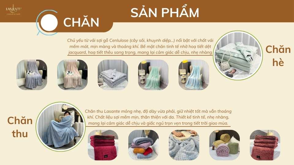 Các sản phẩm chăn hè của Lasante chủ yếu được làm từ vải sợi gỗ với đặt tính mềm mát, thoáng khí và an toàn với họa tiết, thiết kế đa dạng phong phú.