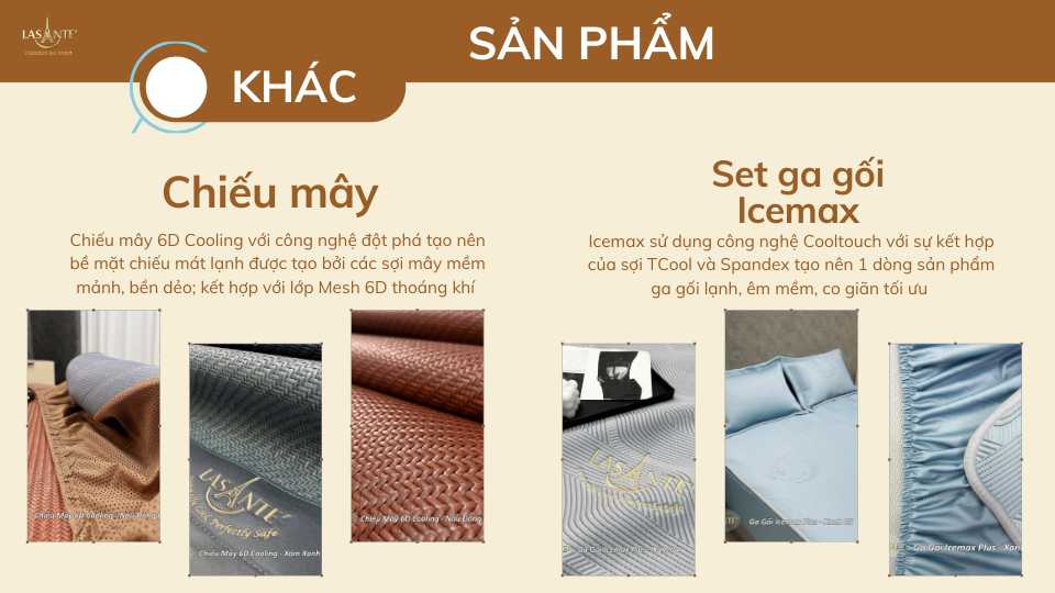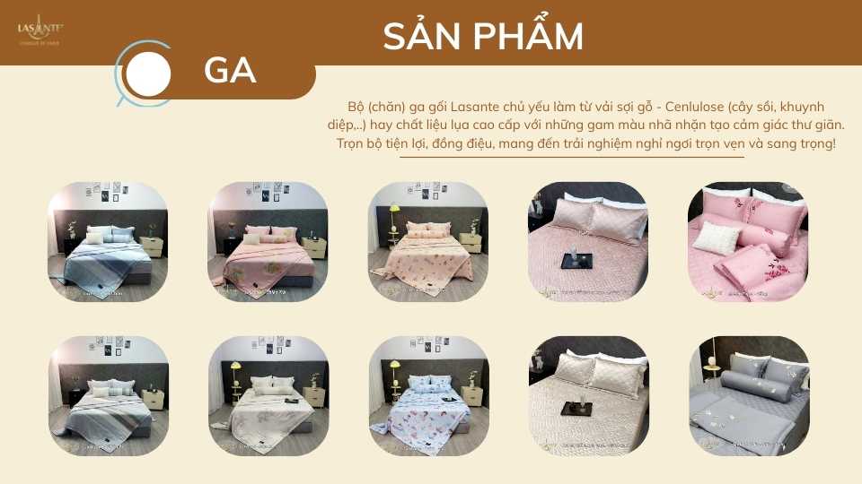 Lasante xây dựng hệ thống sản phẩm chăn ga gối đệm đa dạng và phong phú, đáp ứng trọn vẹn nhu cầu sử dụng của nhiều nhóm khách hàng khác nhau. Từ các dòng sản phẩm phục vụ mùa hè mát mẻ, thoáng khí đến chăn đông êm ấm, giữ nhiệt hiệu quả, mỗi thiết kế đều được nghiên cứu kỹ lưỡng nhằm nâng cao chất lượng giấc ngủ. Không chỉ mang lại sự tiện nghi, Lasante còn chú trọng yếu tố sức khỏe, giúp khách hàng chăm sóc và bảo vệ giấc ngủ một cách toàn diện, bền vững và lâu dài.
