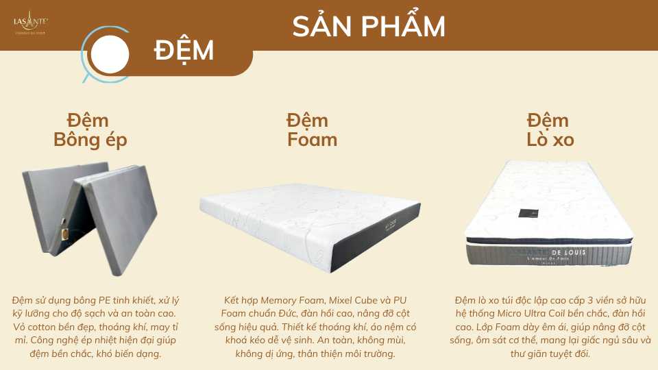 Mỗi sản phẩm của Lasante đều được sản xuất hoặc nhập khẩu với quy trình kiểm định nghiêm ngặt, đảm bảo độ bền, êm ái và an toàn. Từ chất liệu thân thiện với làn da đến thiết kế tối giản nhưng đầy tinh tế, Lasante cam kết đồng hành cùng từng giấc ngủ, từng nhịp sống của gia đình Việt!